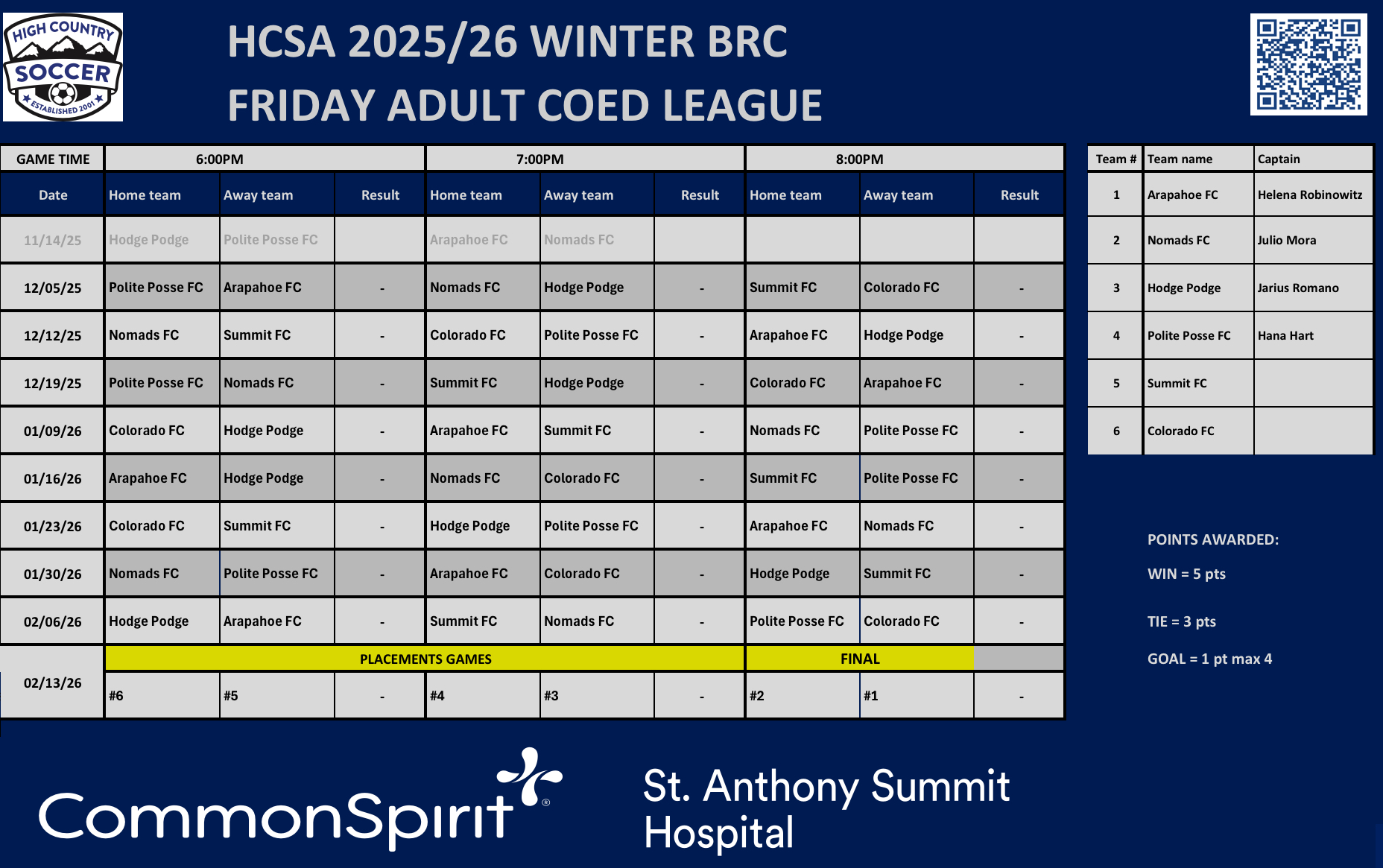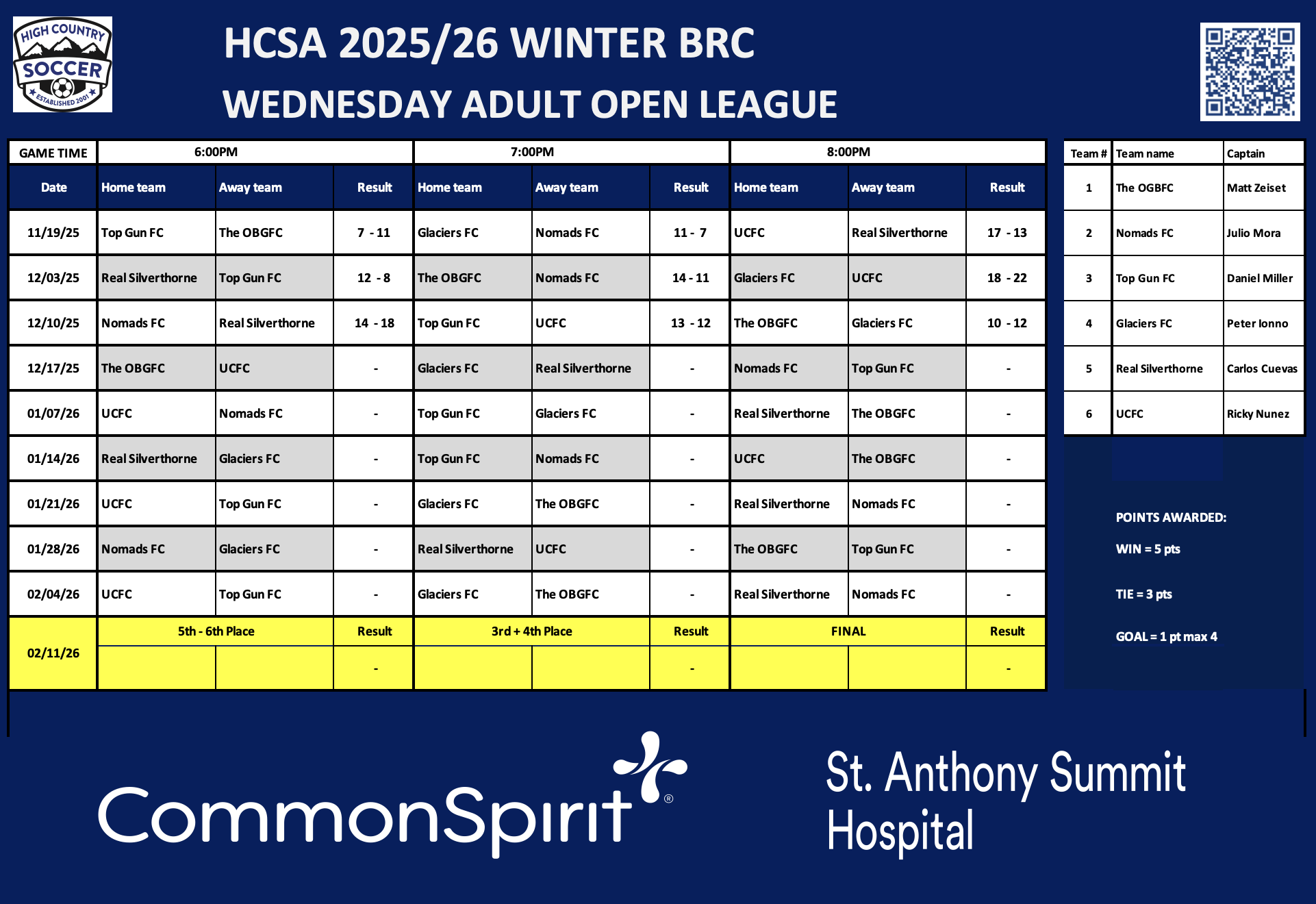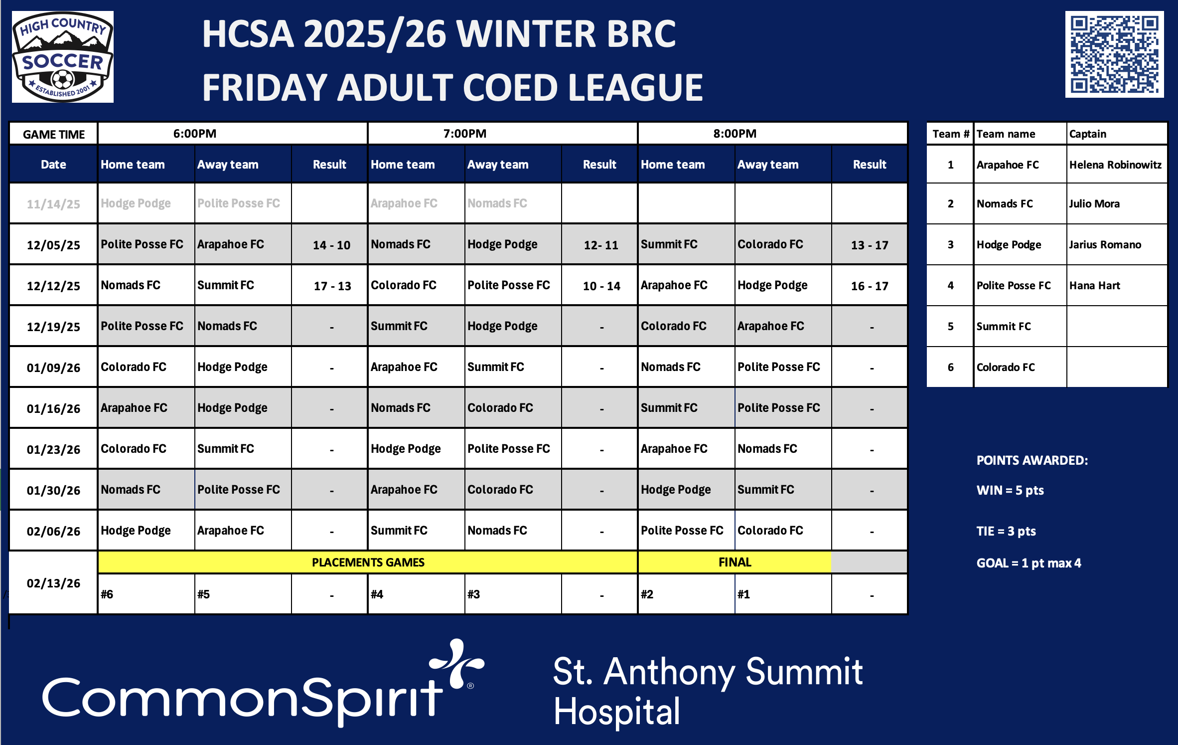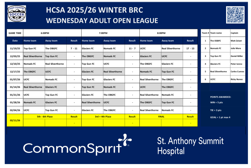 Safety is first and foremost in all High Country Soccer leagues and all league referees and supervisors have the responsibility and final decision to ensure every player's safety is the highest concern in any match.