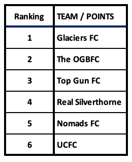 Equipos registrados - Capitanes de equipo: Glaciers FC - Peter Ionno Nomads FC - Julio Mora OGBFC - Matt Zeiset Real Silverthorne - Carlos Cuevas Top Gun FC - Daniel Miller UCFC - Ricky Nunez