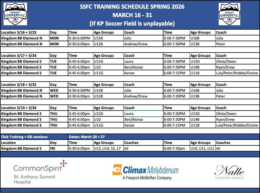 Training sessions in the fall will be held once a week in Breckenridge and once a week in Frisco and/or Silverthorne. The Friday Club training sessions will be held at Kingdom Park for the U10, U11, U12 (late) and U13, U14, 15 and 17 age groups (early). GK training will be held on Fridays: U10-U12 late and U13-U17 (early).