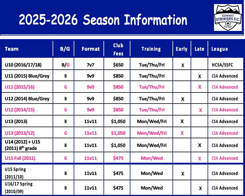 A temporada de outono da SSFC começa com um período de treinamento de quatro dias para as equipes, na primeira segunda-feira de agosto. Os treinos acontecem duas vezes por semana, às segundas e quartas ou às terças e quintas, no final da tarde, em Breck ou Silverthorne, até o final de outubro. Durante os meses de inverno, de janeiro a março, as equipes jogam uma partida semanal no ginásio do Centro Recreativo de Silverthorne ou no ginásio coberto de grama sintética da SHS. A temporada de primavera começa no final de março e vai até o final de maio.