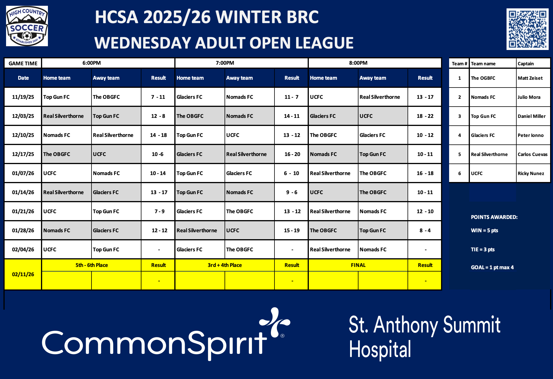 The 2025/26 HCSA Adult indoor OPEN League will be played at the Breck Recreation Center Turf on Wednesdays.