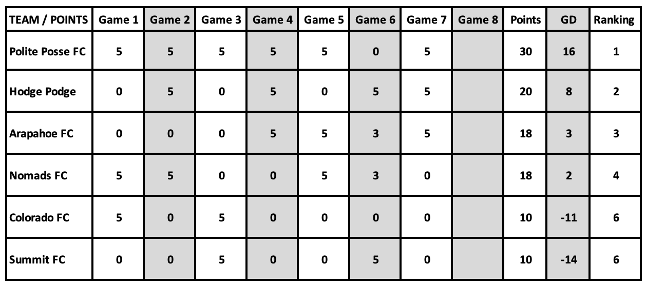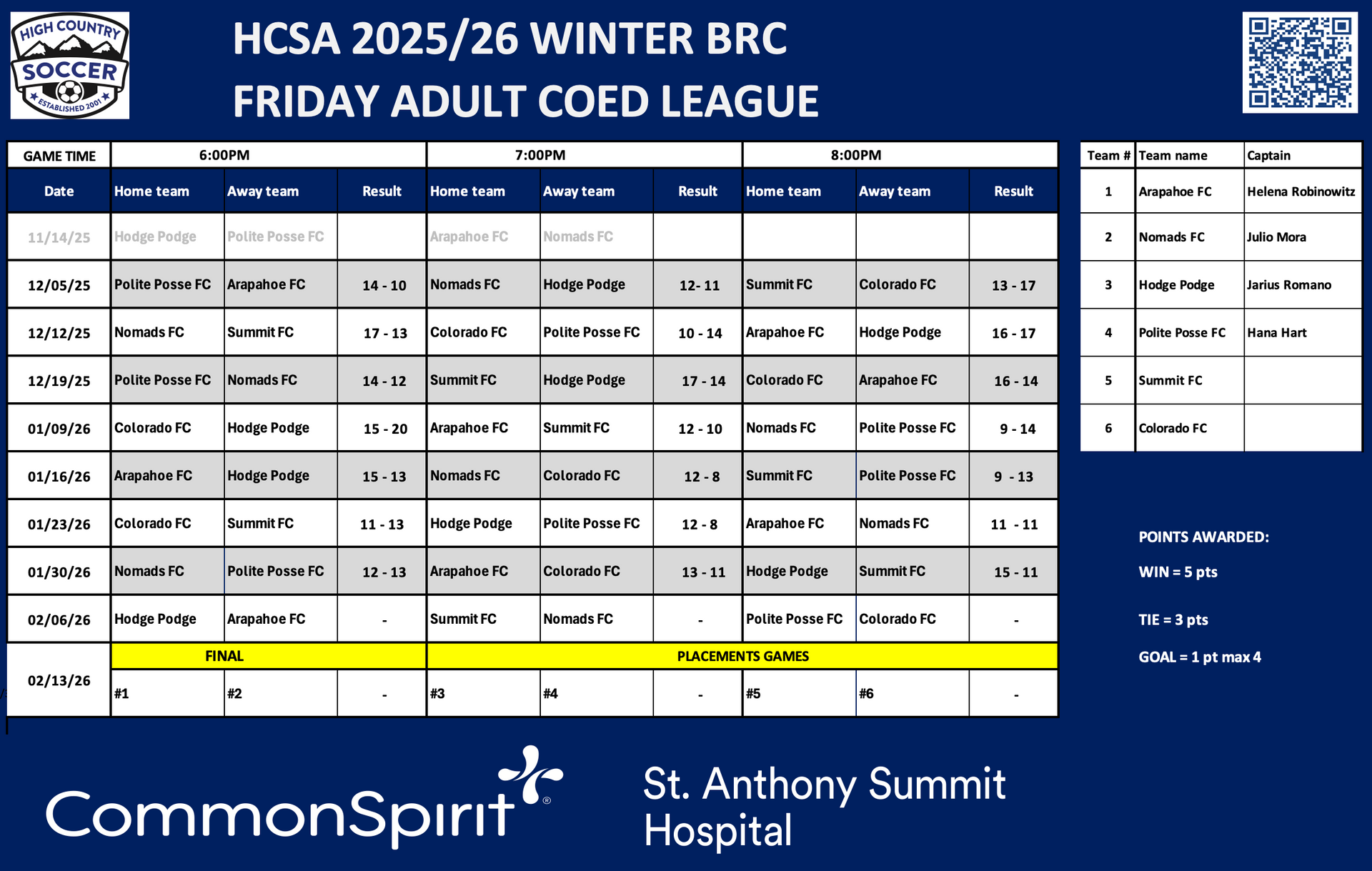 The 2025/26 HCSA Adult indoor COED League will be played at the Breck Recreation Center Turf on Fridays.