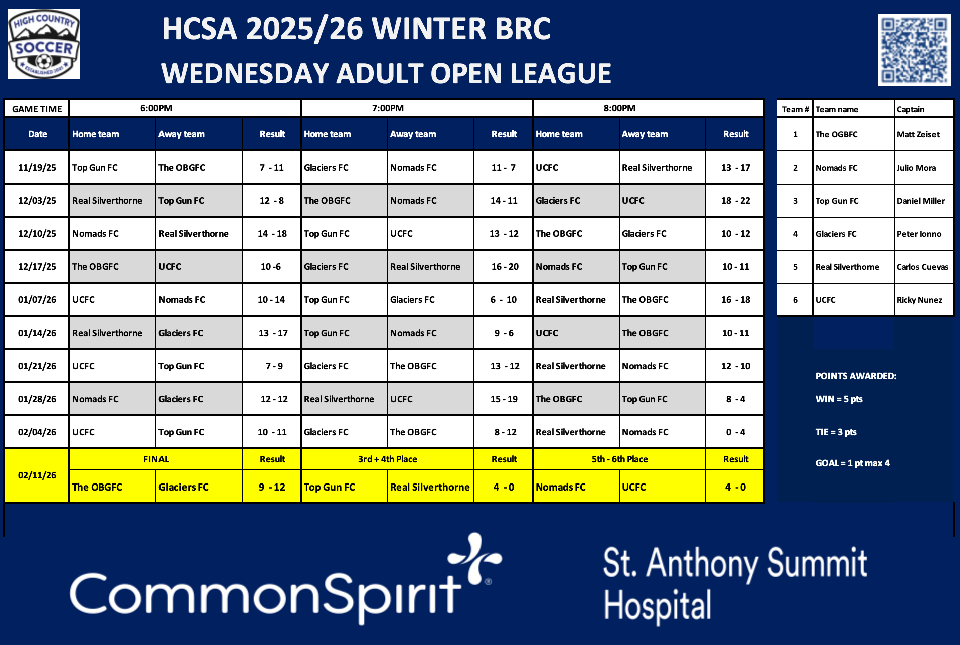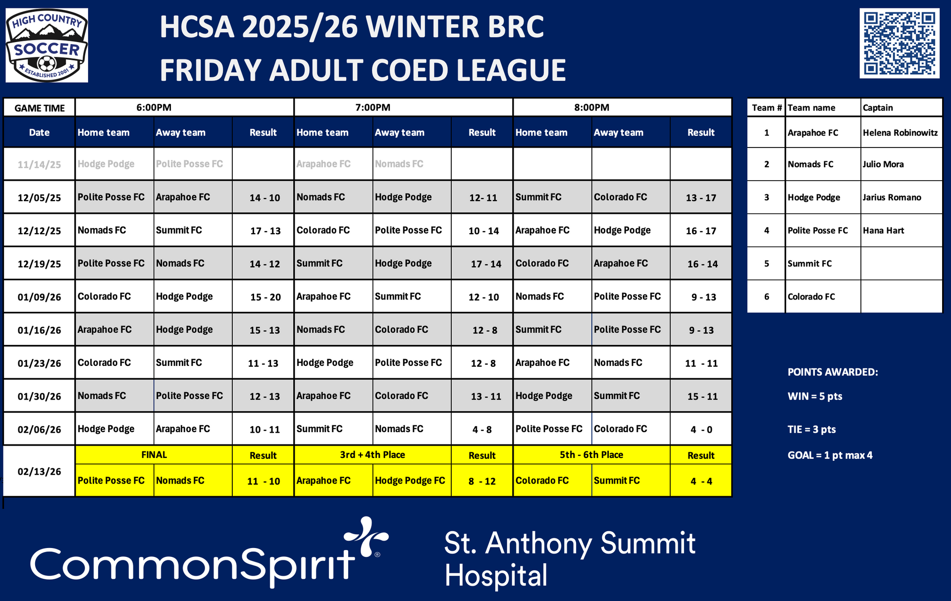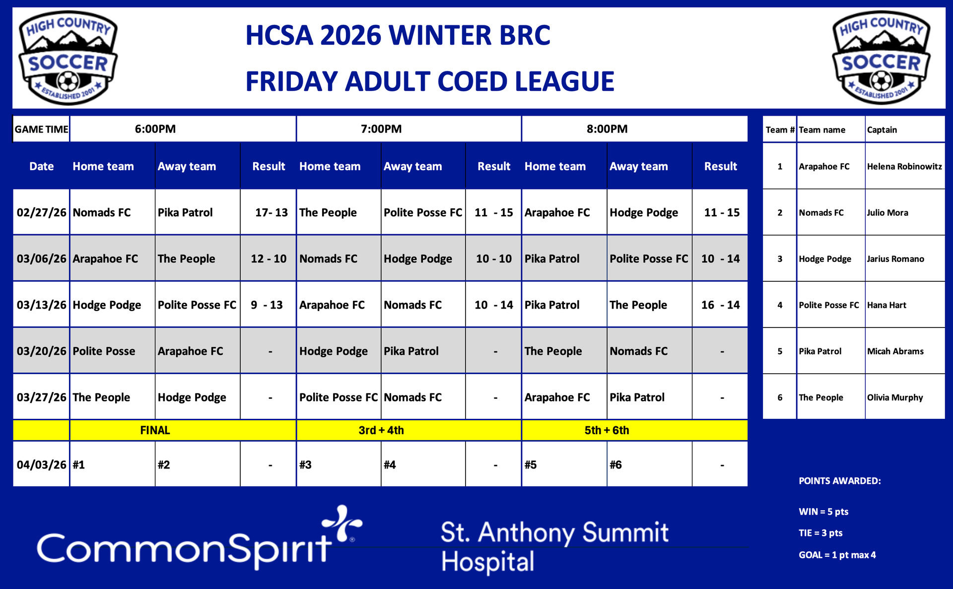 The 2026 HCSA Adult indoor COED League will be played at the Breck Recreation Center Turf on Fridays.